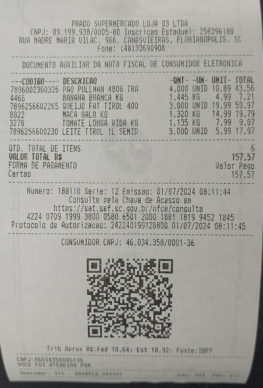 | 01/07/2024 | Supermercado PRADO - café da manhã e tarde | 188118 | Corrente SCD | Alimentação | 157,57 |