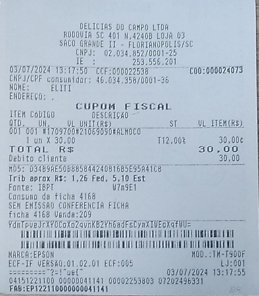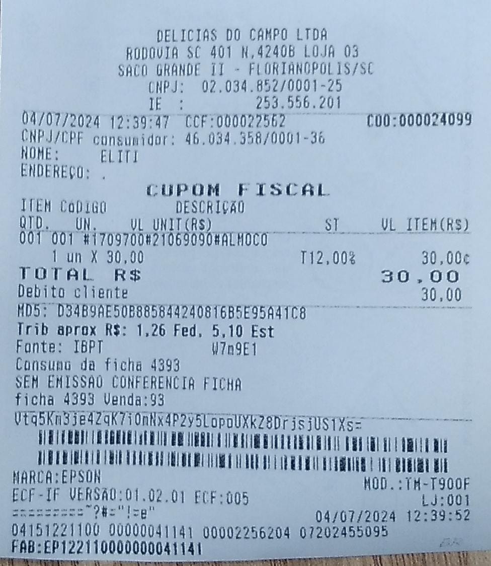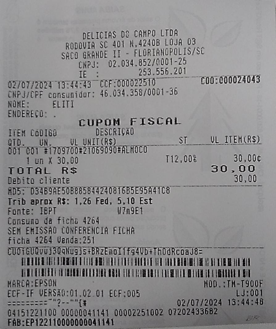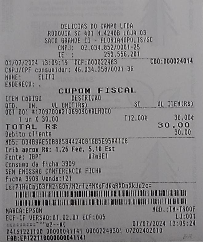 | 03/07/2024 | Almoço - Delícias do Campo - 1 pessoa | 24073 | Corrente SCD | Alimentação | 30,00 |