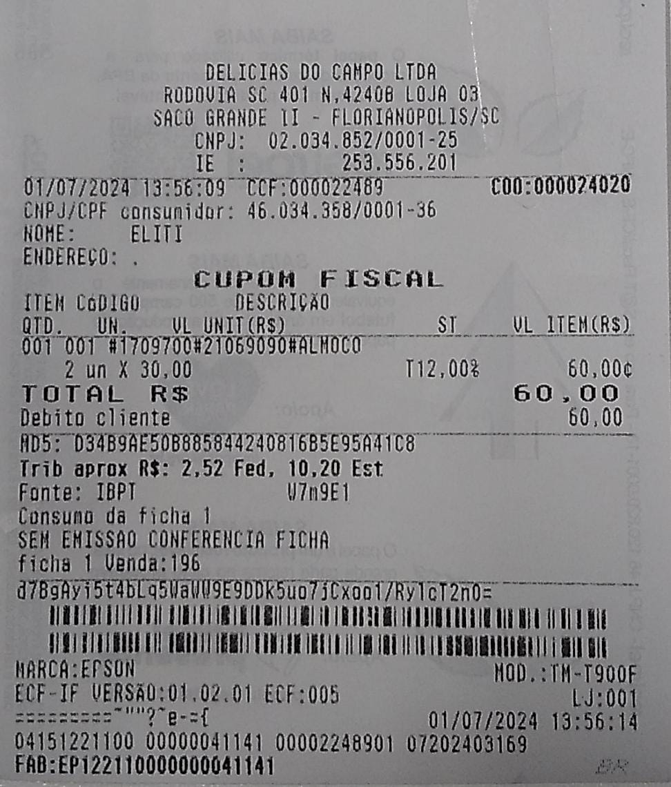 | 01/07/2024 | Almoço - Delícias do Campo - 2 pessoas | 24020 | Corrente SCD | Alimentação | 60,00 |