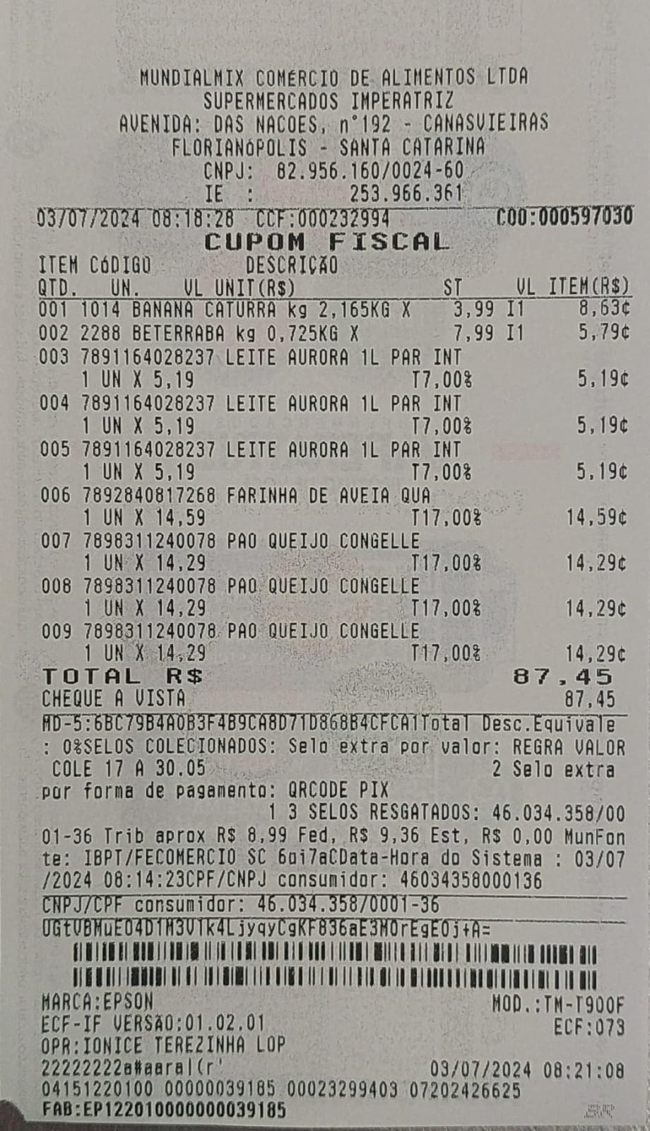 | 03/07/2024 | Supermercado Imperatriz - café da manhã para toda a semana | 597030 | Corrente SCD | Alimentação | 87,45 |