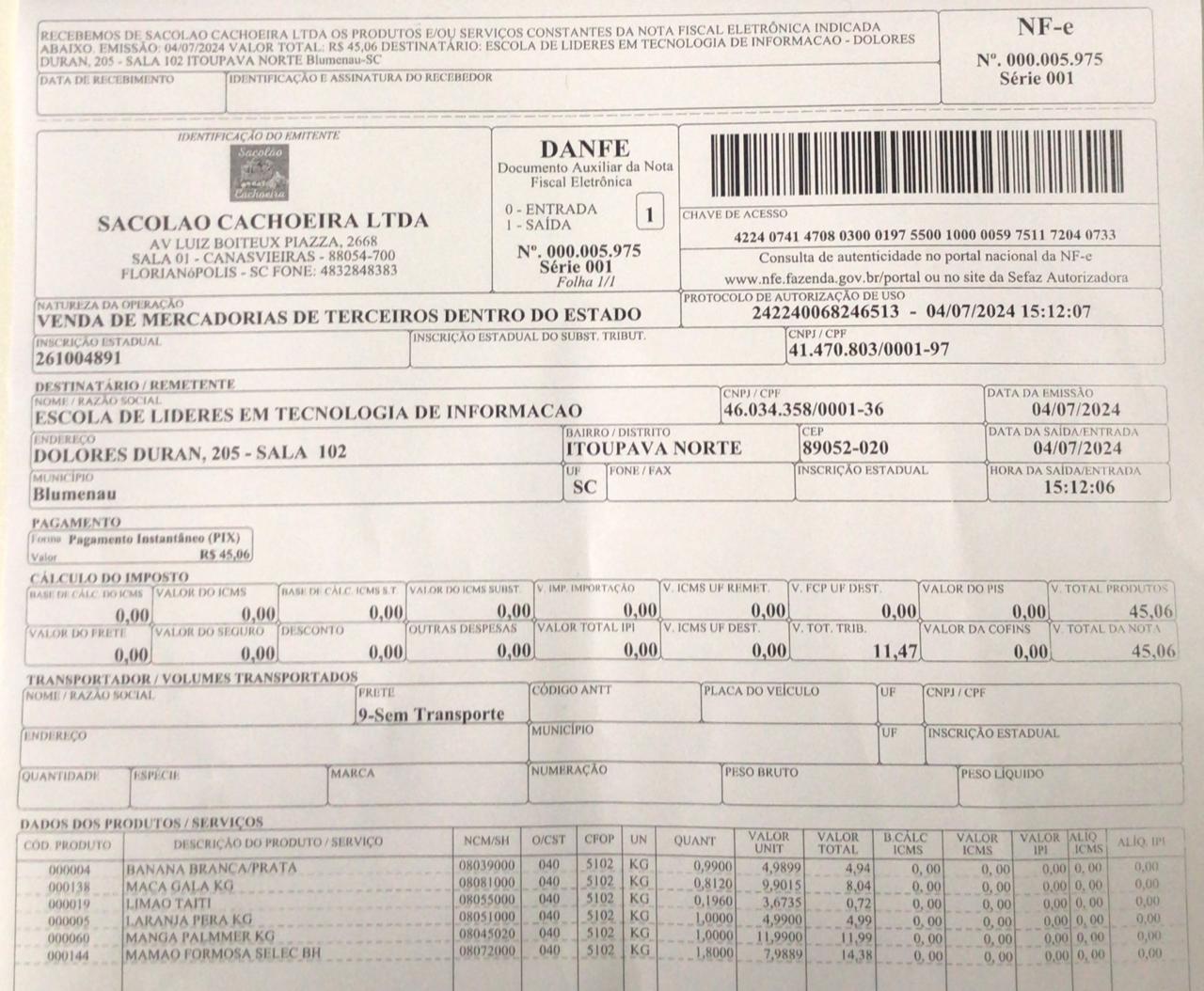 | 04/07/2024 | Sacolão Cachoeira LTDA - Frutas da semana | 5975 | Corrente SCD | Alimentação | 45,06 |