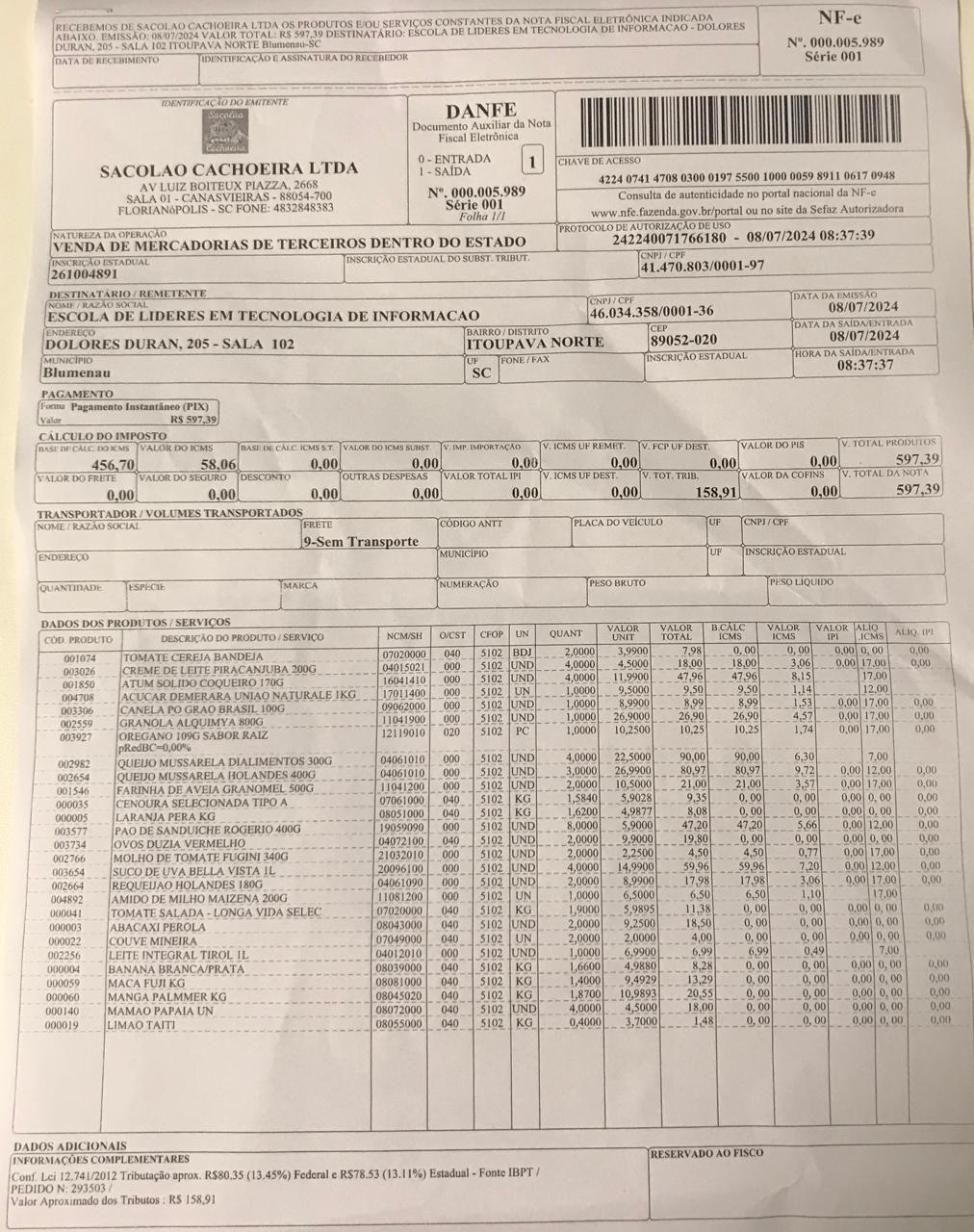 | 08/07/2024 | Sacolão Cachoeira LTDA - Café da semana manhã/tarde | 5989 | Corrente SCD | Alimentação | 597,39 |