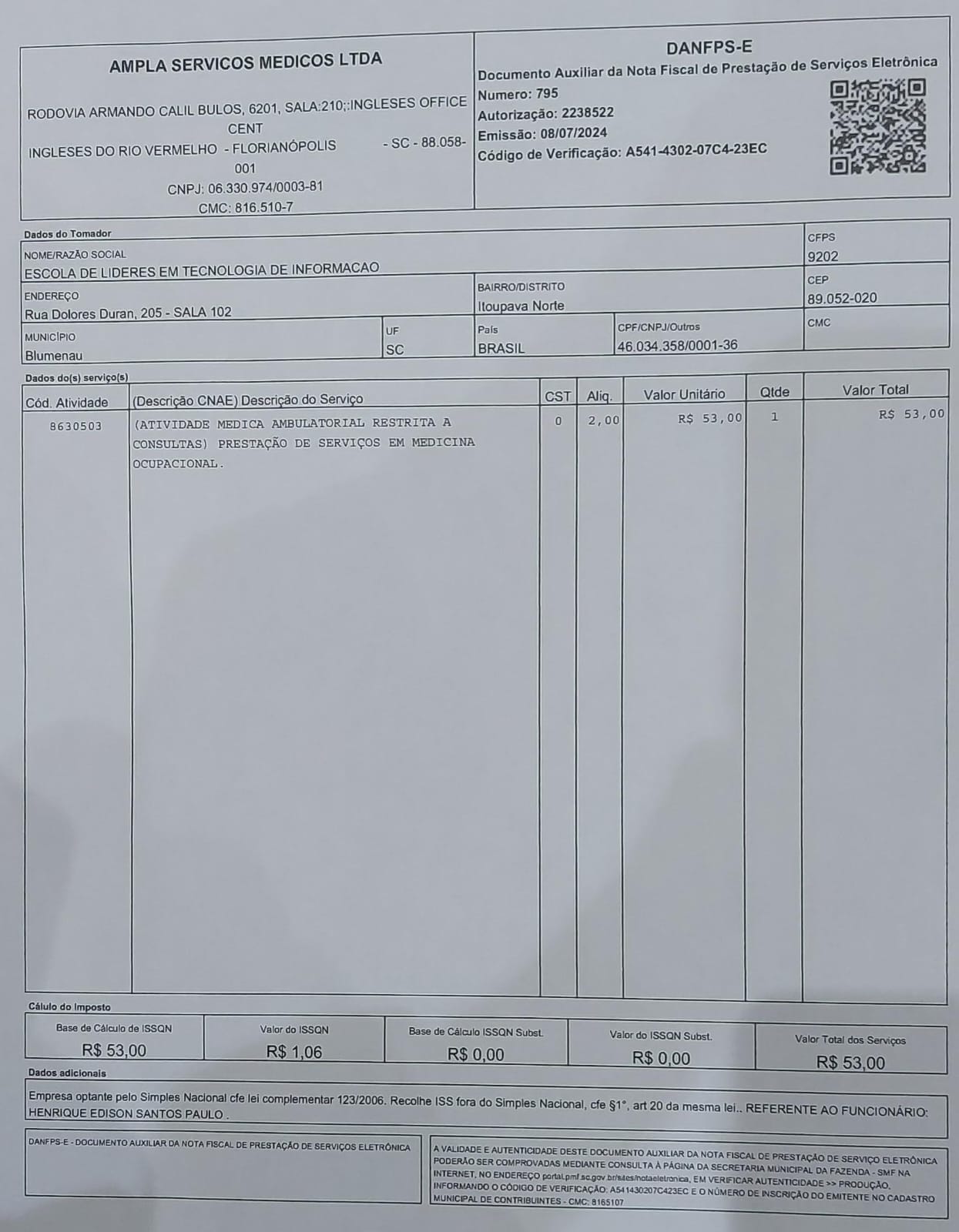 | 08/07/2024 | Exame admissional Ampla Médica | 795 | Corrente SCD | Equipe | 53,00 |