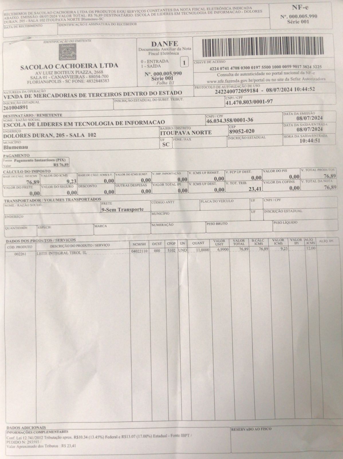 | 21/07/2024 | Fort Atacadista - Café da semana manhã/tarde | 435576 | Corrente SCD | Alimentação | 406,55 |