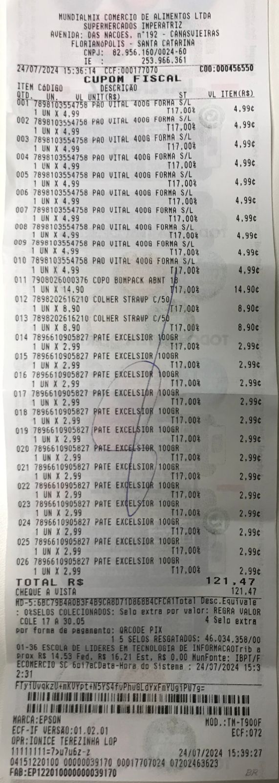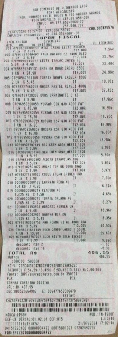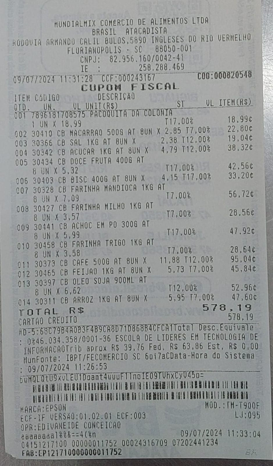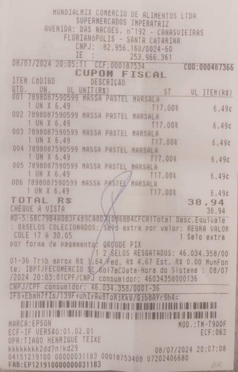 | 08/07/2024 | Supermercado Imperatriz | 487366 | Corrente SCD | Alimentação | 38,94 |