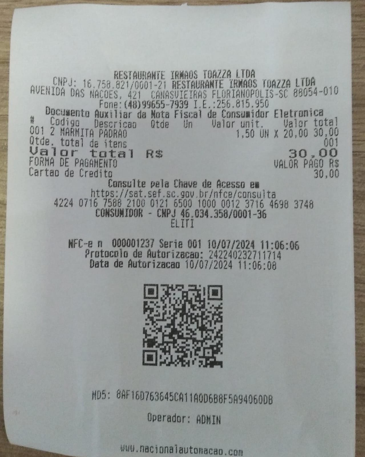 | 09/07/2024 | Almoço - Restaurante Irmãos - 1 pessoa | 1237 | Corrente SCD | Alimentação | 30,00 |