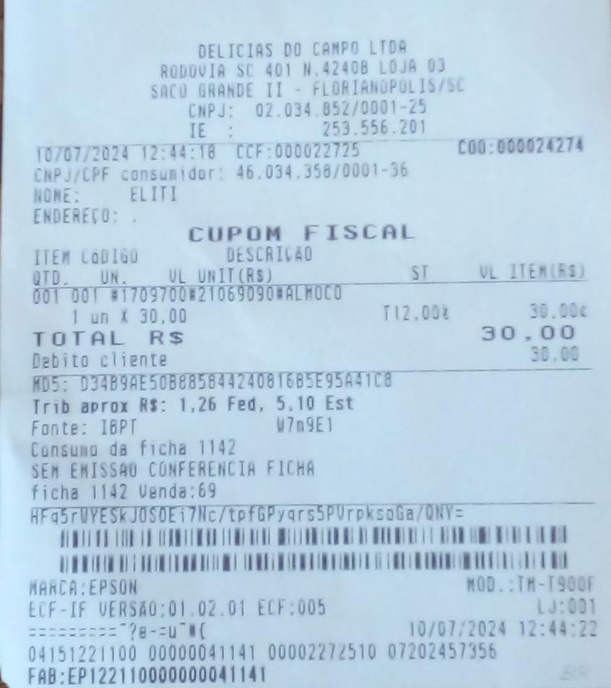 | 10/07/2024 | Almoço - Delícias do Campo - 1 pessoa | 24274 | Corrente SCD | Alimentação | 30,00 |