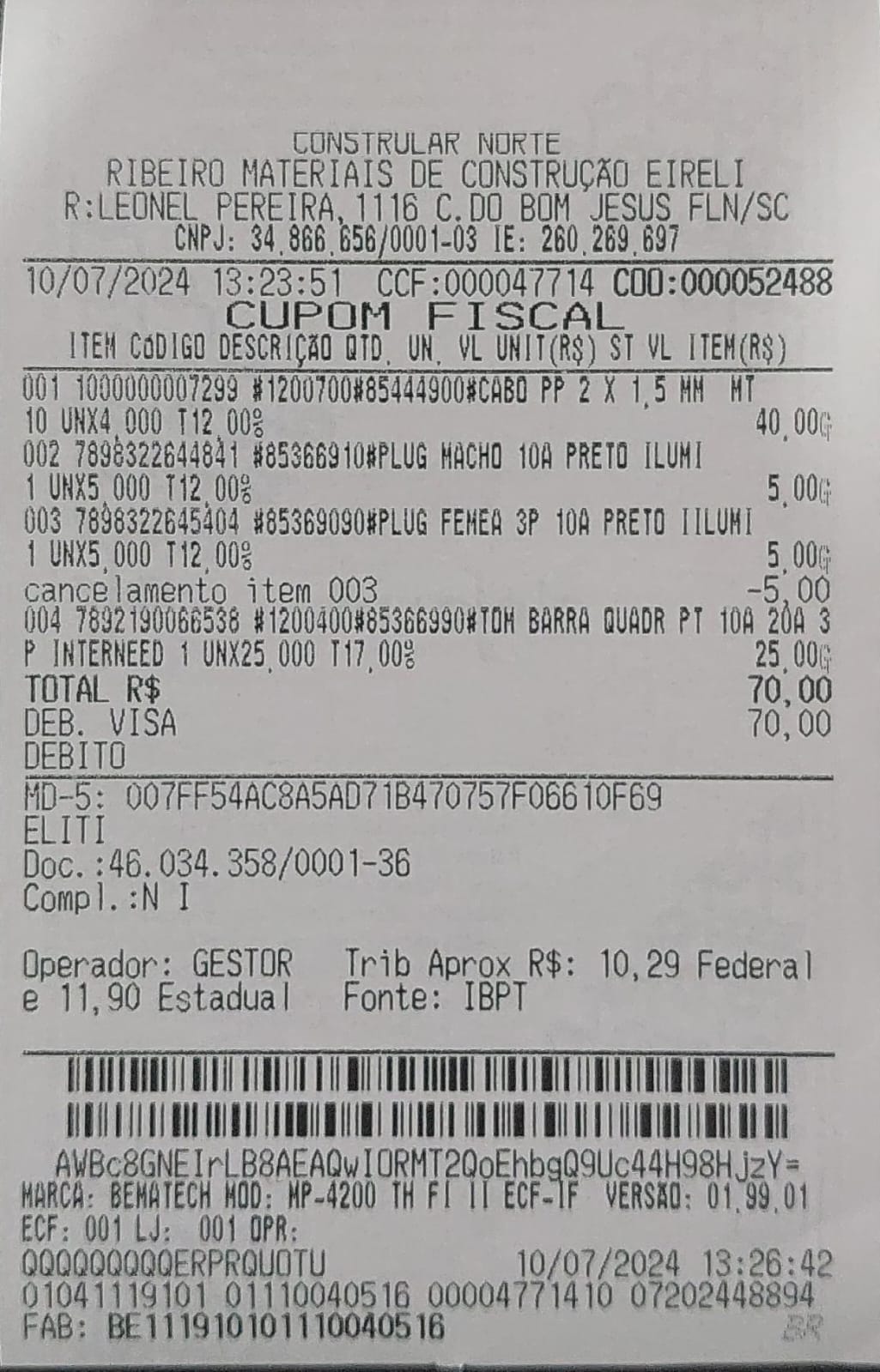 | 10/07/2024 | Extensão 10 metros para comunidade Vila Esperança | 52488 | Corrente SCD | Hardware | 70,00 |