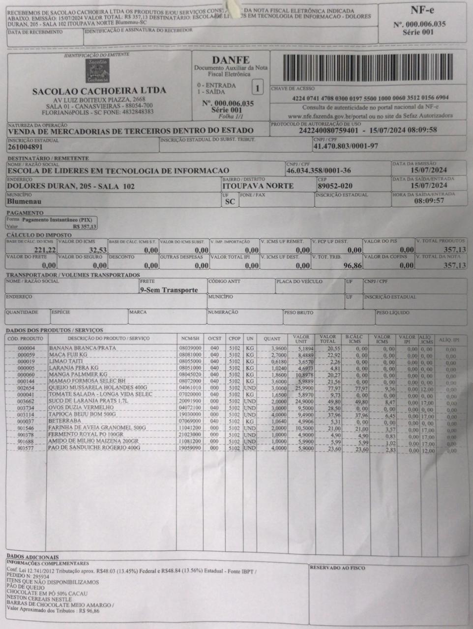 | 15/07/2024 | Sacolão Cachoeira LTDA - frutas e café da semana manhã/tarde | 6035 | Corrente SCD | Alimentação | 357,13 |