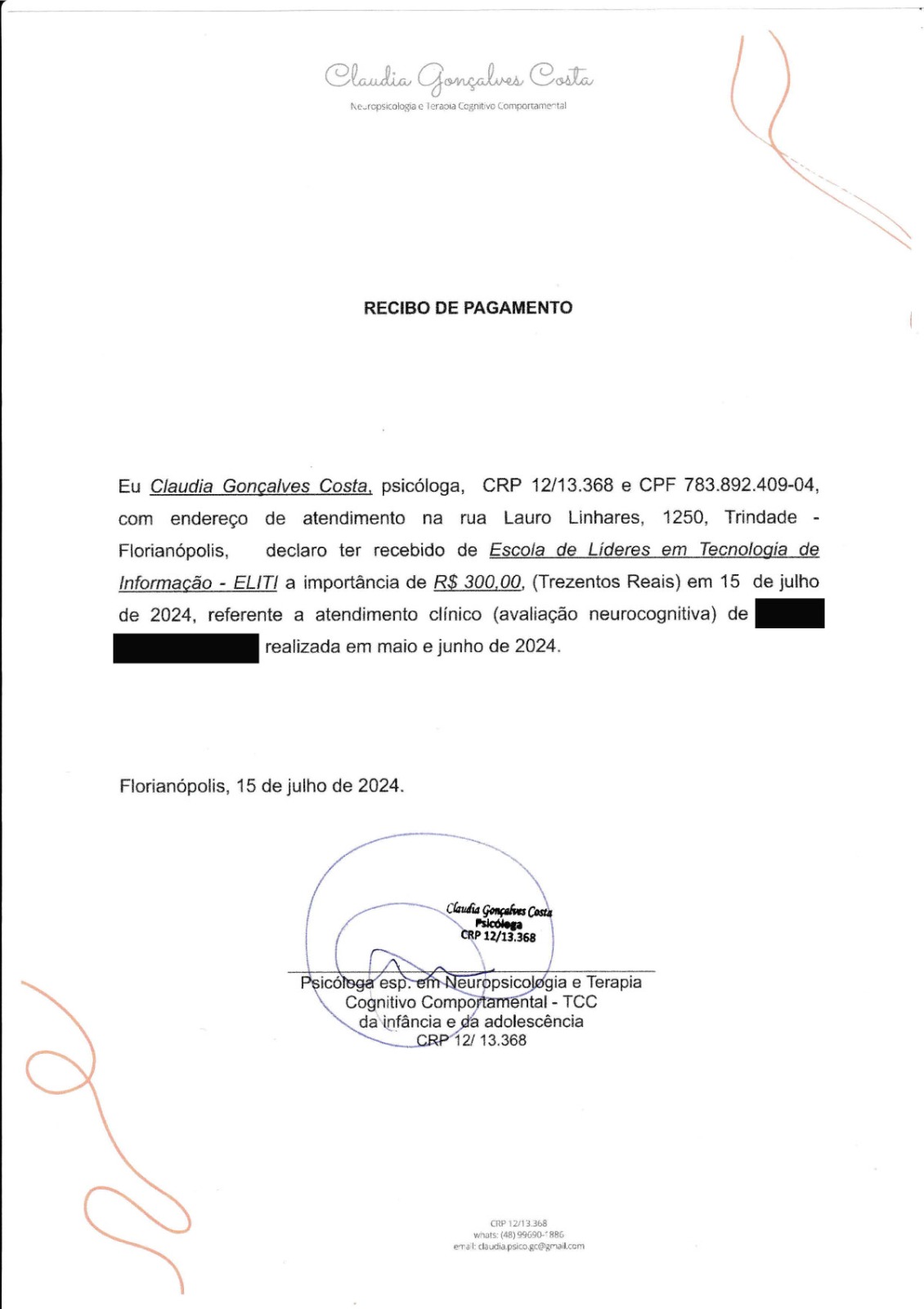 | 15/07/2024 | Avaliação neurocognitiva de estudante com Cláudia | 01 | Corrente SCD | Outros Apoios | 300,00 |