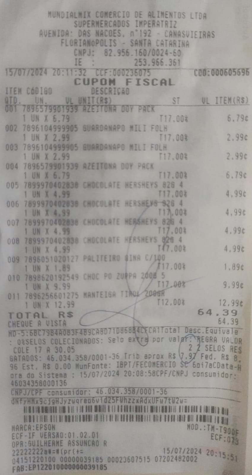 | 15/07/2024 | Supermercado Imperatriz | 605696 | Corrente SCD | Alimentação | 64,39 |