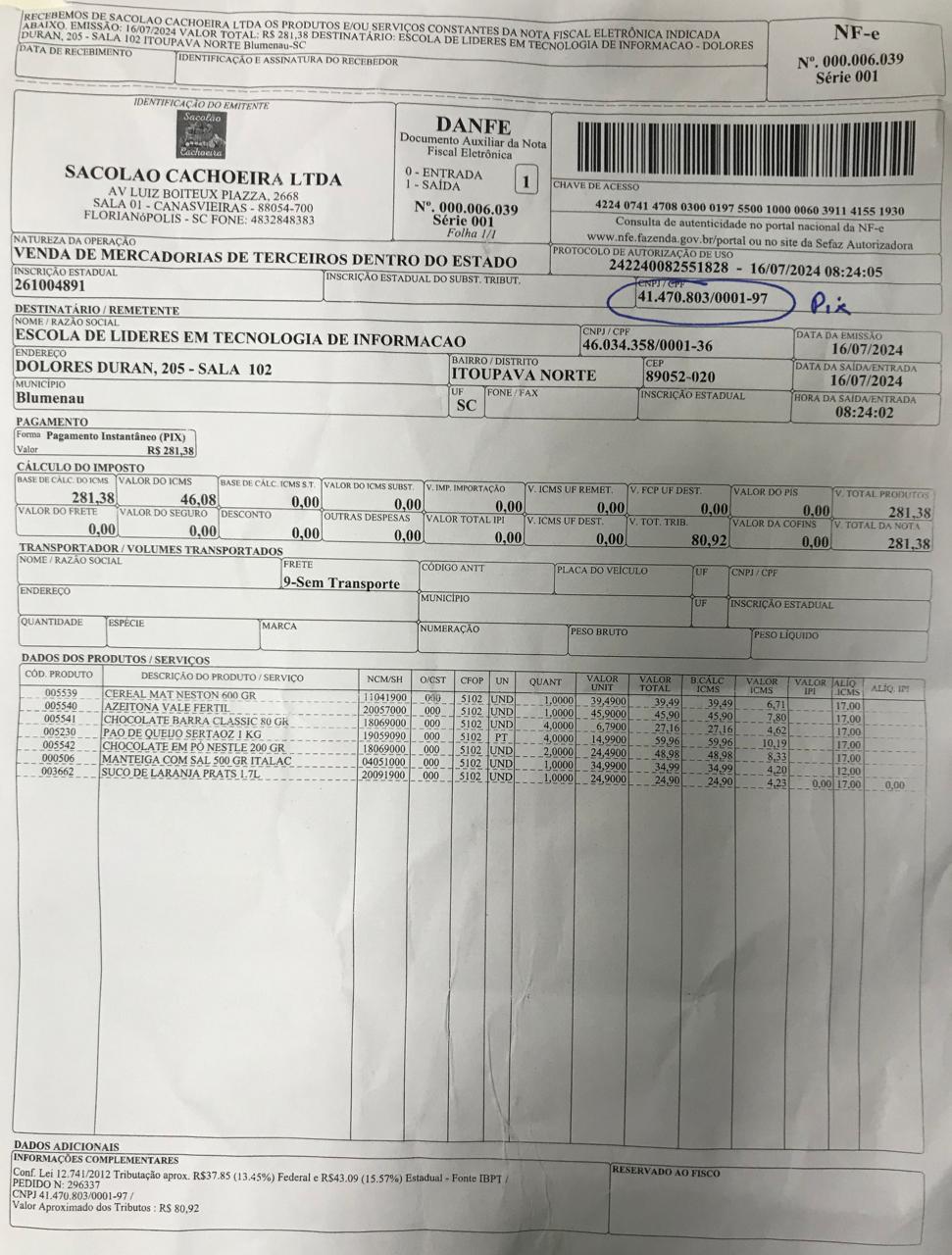 | 16/07/2024 | Sacolão Cachoeira LTDA - itens que faltou | 6039 | Corrente SCD | Alimentação | 281,38 |