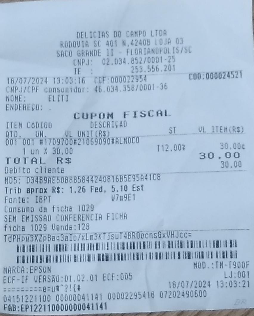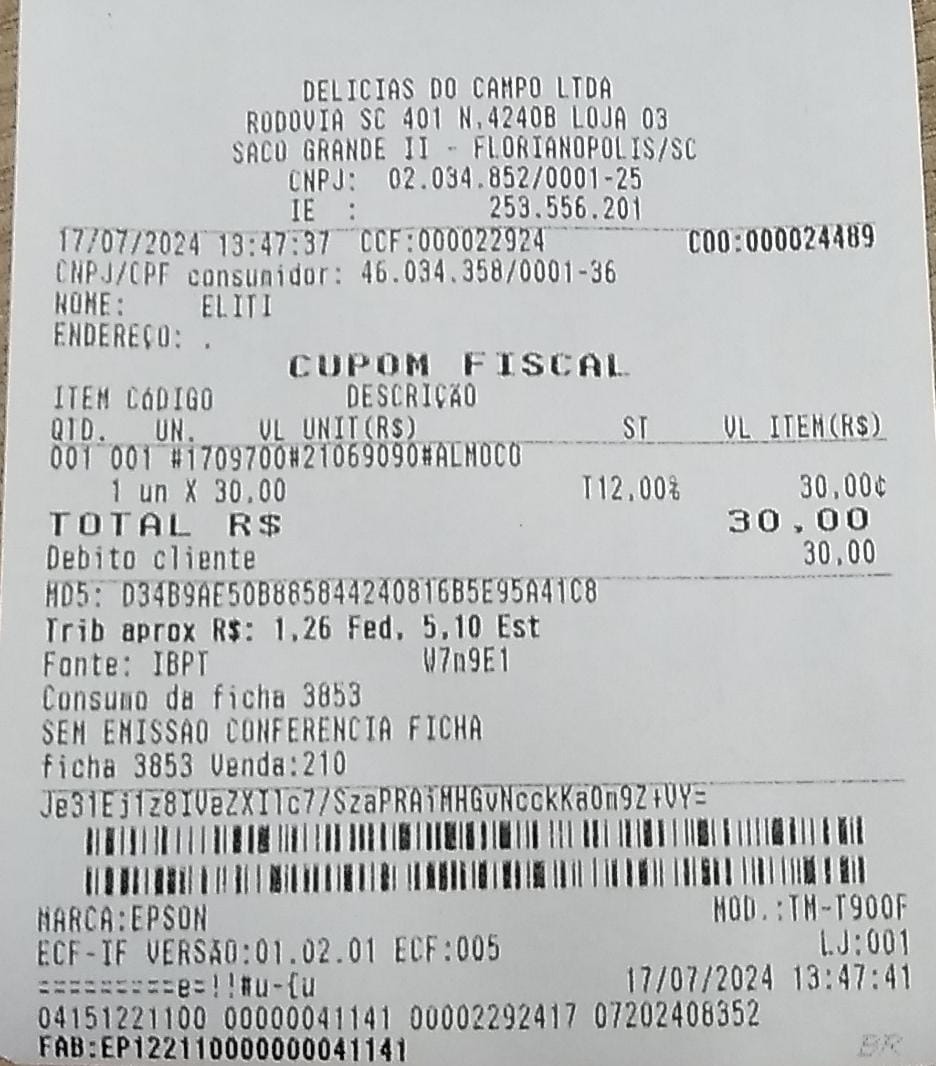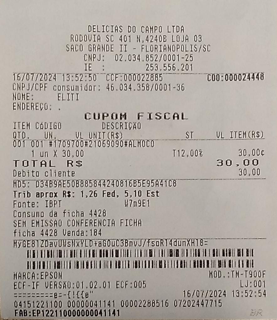 | 16/07/2024 | Almoço - Delícias do Campo - 1 pessoa | 24521 | Corrente SCD | Alimentação | 30,00 |