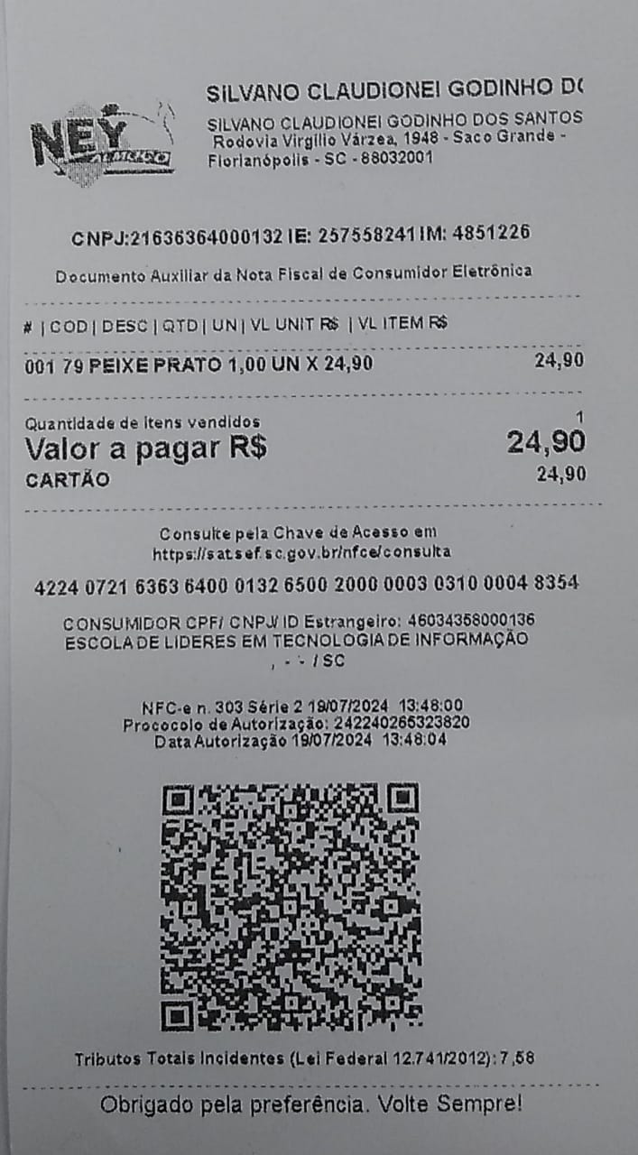 | 19/07/2024 | Almoço - Ney Lanches - 1 pessoa | 303 | Corrente SCD | Alimentação | 24,90 |