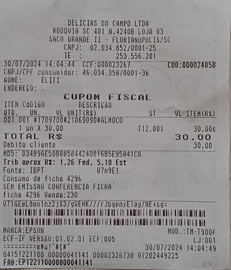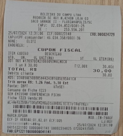 | 24/07/2024 | Almoço - Delícias do Campo - 1 pessoa | 24693 | Corrente SCD | Alimentação | 30,00 |