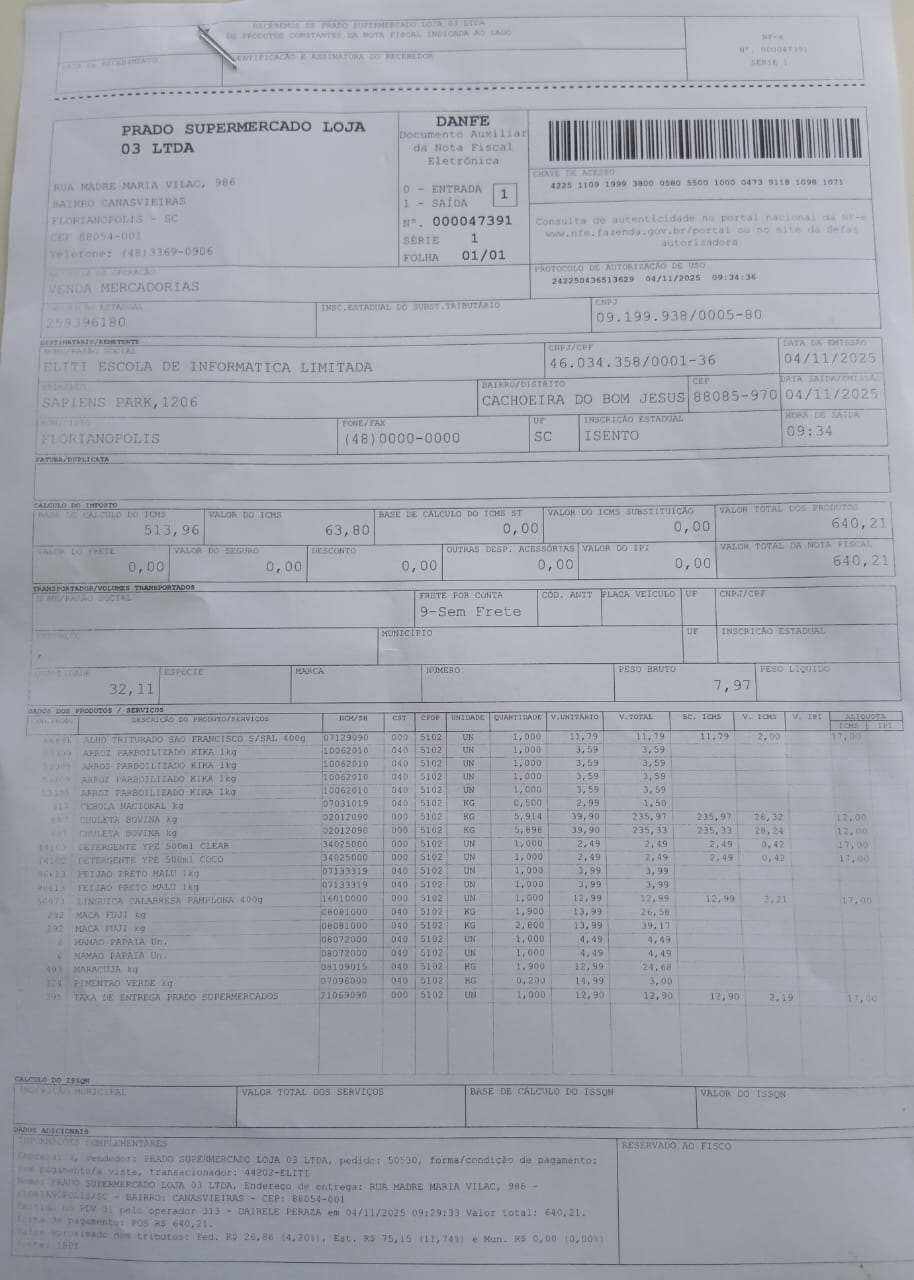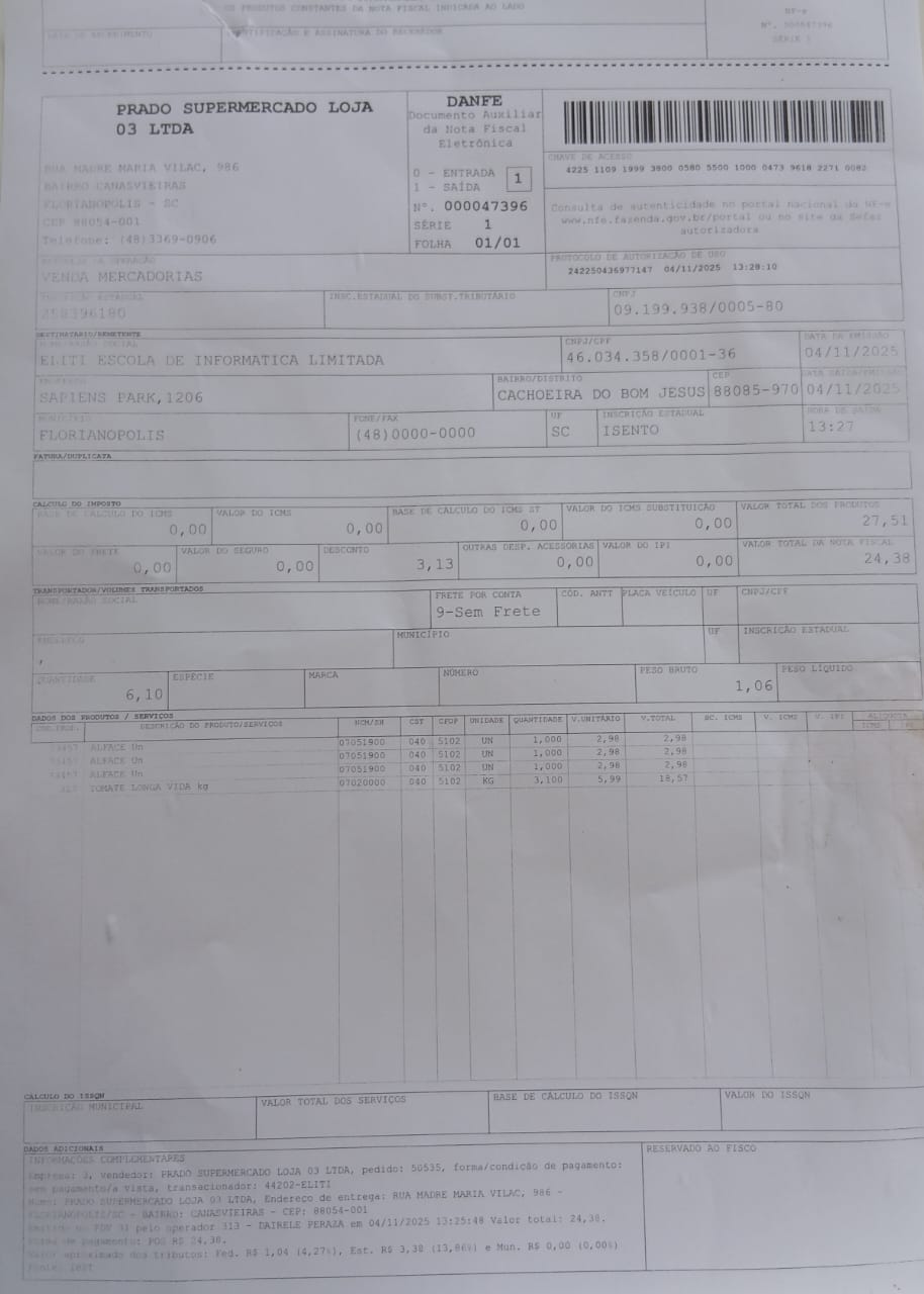 | 04/11/2025 | ALIMENTAÇÃO ELITI KIDS (PRADO SUPERMERCADO) | 47396 | Corrente SCD | Alimentação | 24,38 |